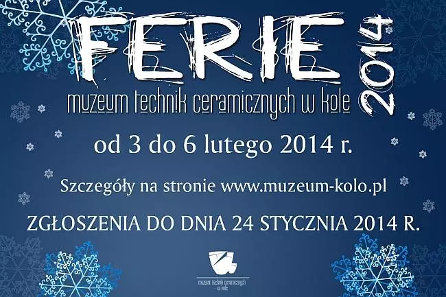 Muzeum Technik Ceramicznych w Kole ogłasza nabór dzieci klas II-VI szkół podstawowych na półkolonie zimowe „Ferie w muzeum” (03.02 –06.02.2014 r.). Dzieci uczęszczające do szkół, których organem prowadzącym jest Gmina Miejska Koło zapraszamy do udziału w zimowych półkoloniach organizowanych przez muzeum.