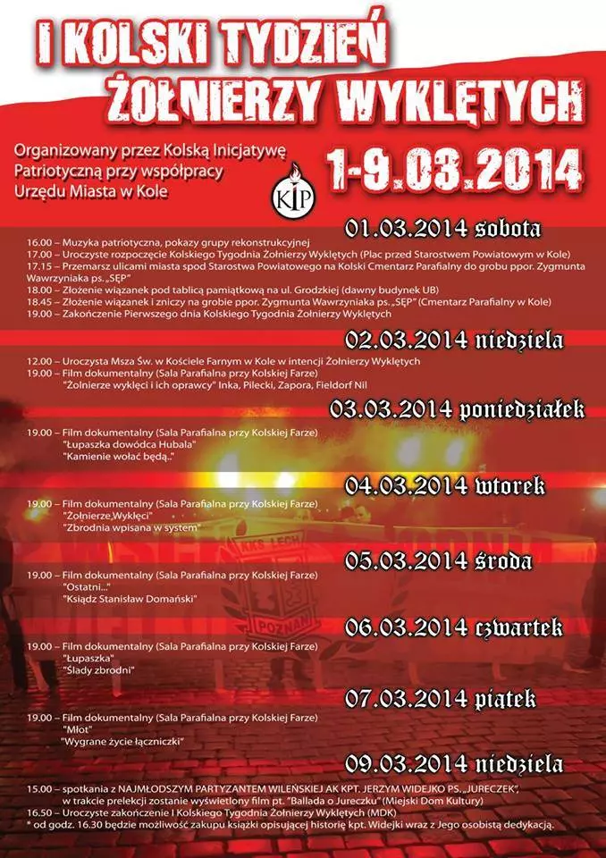 19.00 – Film dokumentalny (Sala Parafialna przy Kolskiej Farze) "Żołnierze Wyklęci" "Zbrodnia wpisana w system"