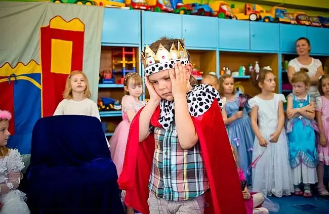 Grupa II cztrolatków zaprosiła do swojego królestwa mamy i tatusiów. Mieszkał w nim straszny potwór. Oprócz tego była królewna piękna bardzo, szewczyk dzielny, król zatroskany, damy dworu eleganckie niezwykle, owieczka spłoszona trochę, rycerze i dworzanie a nawet bajkopisarz. W pierwszym takim przygotowanym przez 4 latki przedstawieniu mali aktorzy zmierzyli się ze smokiem i własna tremą. Tylko... właściwie wcale nie było jej widać. Było za to dużo naturalności w tej zabawie w teatr. Mali aktorzy posługiwali się ruchem scenicznym , gestami, bogatą mimiką , zmienną intonacją głosu. Elementy scenografii , stroje i rekwizyty stworzyły teatralną iluzję. Przedstawienie ilustrowały fragmenty utworów muzyki klasycznej podkreślające akcję, emocje, uczucia i wywołujące na scene kolejne postaci. Wplecione w spektakl piosenki "Tato pomóż" i "Walczyk dla mamy" zgrabnie łaczyły się z tematem rodzinnego święta i scenariuszem bajki. Czy się udało? Brawa były na stojąco! A potem zasłużona nagroda czyli deser w kawiarence "Fantazja" w towarzystwie rodziców.