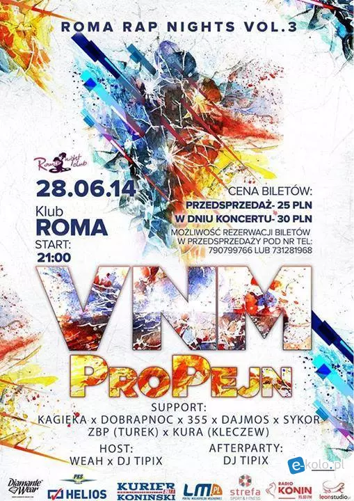 Mamy przyjemność zaprosić na kolejny bo trzeci już z serii \"Roma Rap Nights\" koncert, który odbędzie się 28 czerwca o godzinie 21:00 w Klub Roma. Tym razem na scenie wystąpi nie kto inny, a znany dobrze wszystkim polski raper VNM promujący swój najnowszy album zatytułowany Propejn.