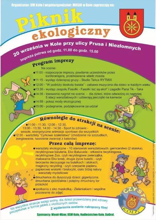 20 września w Kole w przestrzeni miejskiej – u zbiegu ulic: Prusa i Niezłomnych – odbędzie się Piknik Ekologiczny. Impreza potrwa od godziny 11.00 do godz. 15.00.