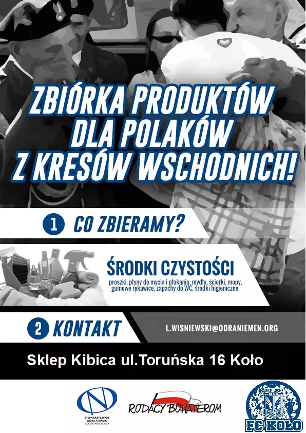 Zbliżają się Święta Bożego Narodzenia, z tej okazji jak co roku, kolski fan club kibiców Lecha Poznań włącza się w akcję Stowarzyszenia Odra Niemen Odział Wielkopolska, która organizuje zbiórkę dla Kresowych Kombatantów i Polakach mieszkających na Kresach. W tym roku skupiamy się na chemii gospodarczej.