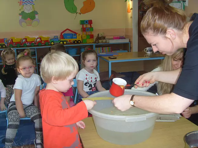 Obecne andrzejki są wesołym spotkaniem towarzyskim dostarczającym wielu przeżyć i emocji. Zabawy andrzejkowe dla swoich wychowanków zorganizowały panie Agnieszka Kuśmierek i Beata Rybicka. Przedszkolaki bawiły się wspólnie aktywnie słuchając muzyki wg metody Batii Strauss („Czarowanie”), składały dary aby wróżby spełniły się – rzucały złotymi monetami do wody, obserwowały zastygający w zimnej wodzie wosk, przelany przez klucz, nadawały nazwy zastygłym bryłom, a właściwie ich cieniom, odgrywały role w czasie zabawy integracyjnej wg Klanzy, patrzyły przez magiczną lunetę wypowiadając swoje marzenia gwiazdkowe (Kochani rodzice! - większość naszych słodziaków chciałaby od Św. Mikołaja dostać...pieska! Co Wy na to? :)) Nie mogło zabraknąć popularnej zabawa z bucikami, a także losowanie kolorów i odpowiadających im wskazówek(przestróg) na miarę przedszkolaków, m.in.: „bądź ostrożny na drodze do przedszkola, patrz uważnie pod nogi i bacznie rozglądaj się na przejściu przez ulicę”, „jesz za dużo słodyczy, musisz je ograniczyć, bo w przyszłości będziesz miał kłopoty z zębami”, „dbaj o swoje zdrowie, jedz więcej warzyw i owoców, ubieraj się ciepło zimą, nigdy nie zapominaj o szaliku!”. Dzieci bardzo wzięły sobie do serca te andrzejkowe przepowiednie. Spotkanie andrzejkowe, nie mogło obyć się bez zabawy tanecznej przy przebojach z repertuaru dziecięcego. Pomocą organizacyjną służyły również ukochane ciocie maluszków i czterolatków: panie Anna Maniak i Maria Szafrańska.