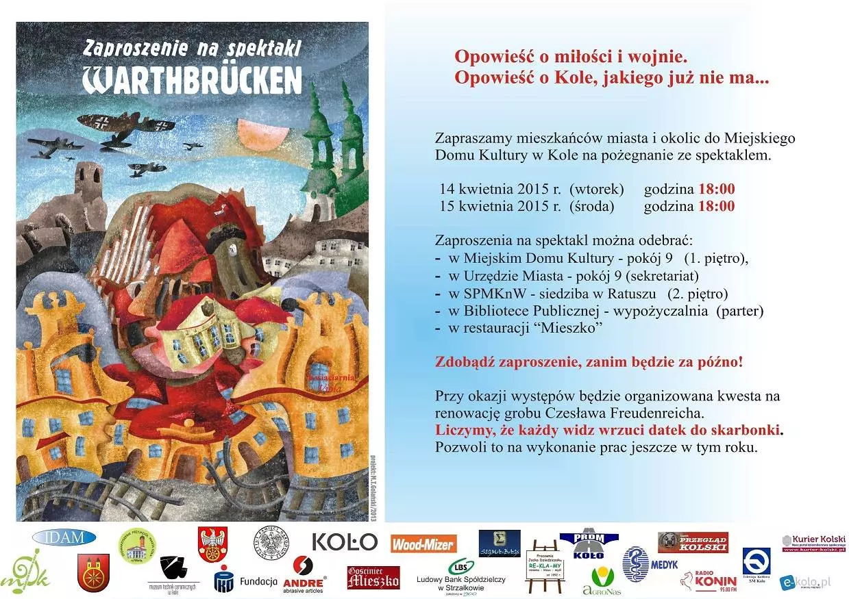 Zaproszenia są bezpłatne. Przy okazji spektaklu będzie prowadzona przez Stowarzyszenie Przyjaciół Miasta Koła n/Wartą kwesta na renowację grobu Czesława Freudenreicha - patrona sztuki, spoczywającego w nader skromnej mogile na cmentarzu parafialnym. Część kwoty na to zadanie jest już zgromadzona, jednak nie wystarczy na wykonanie zadania w całości.