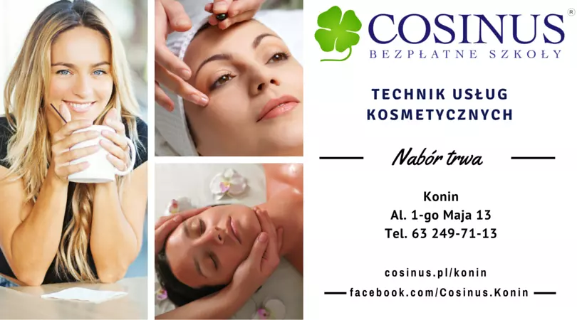 Bezpłatna Zaoczna Policealna Szkoła Cosinus w Koninie zaprasza na zajęcia z kosmetyki, podczas których możesz nauczyć się m. in. diagnozowania rodzajów skóry, wykonywania zabiegów kosmetycznych, leczniczych oraz upiększających na ciało, dłonie i stopy. Prowadzący zajęcia, wykładowcy i nauczyciele ze szkoły Cosinus to specjaliści z doświadczeniem. Szkolenia prowadzone są we własnych pracowniach kosmetycznych wyposażonych w niezbędny sprzęt i urządzenia. W ramach zajęć praktycznych szkoła Cosinus zapewnia bezpłatnie materiały i kosmetyki.