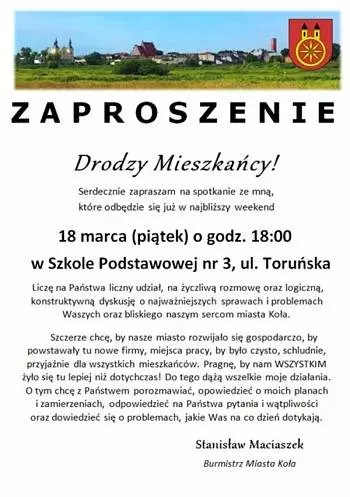 W dniu jutrzejszym zorganizowane zostanie kolejne spotkanie Stanisława Maciaszka z mieszkańcami. Tym razem Burmistrz zaprasza do Szkoły Podstawowej nr 3 w Kole na godzinę 18:00.
