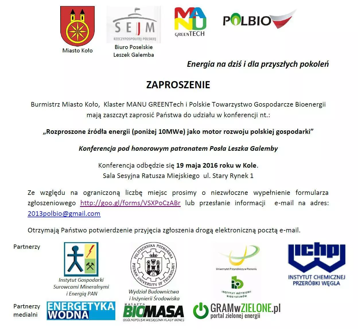 Burmistrz Miasta Koła, Klaster MANU GREENTech i Polskie Towarzystwo Gospodarcze Bioenergii mają zaszczyt zaprosić Państwa do udziału w konferencji nt.: „Rozproszone źródła energii (poniżej 10MWe) jako motor rozwoju polskiej gospodarki”. Konferencja pod honorowym patronatem Posła Leszka Galemby.