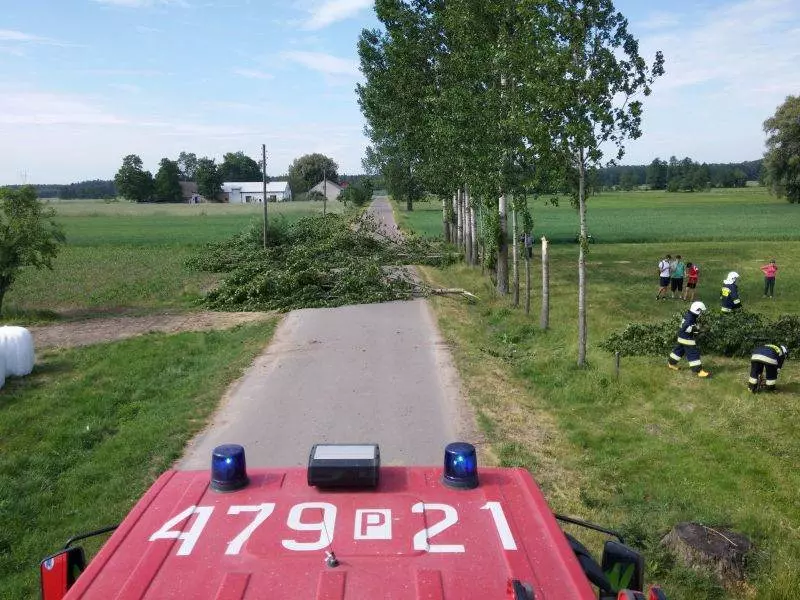 Powalone drzewa uszkodziły linie energetyczną. Działania druhów polegały na zabezpieczeniu miejsca zdarzenia i usunięciu drzew z drogi.