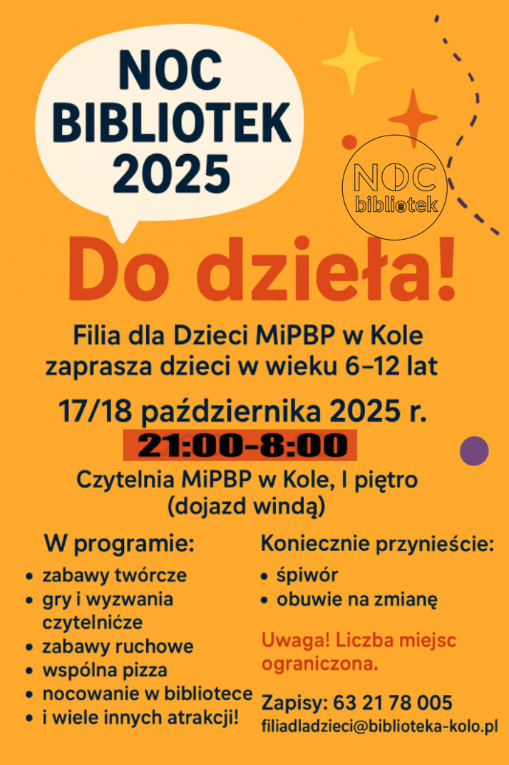 Filia dla Dzieci MiPBP w Kole zaprasza, 6-12-latków, na Noc Bibliotek 2025