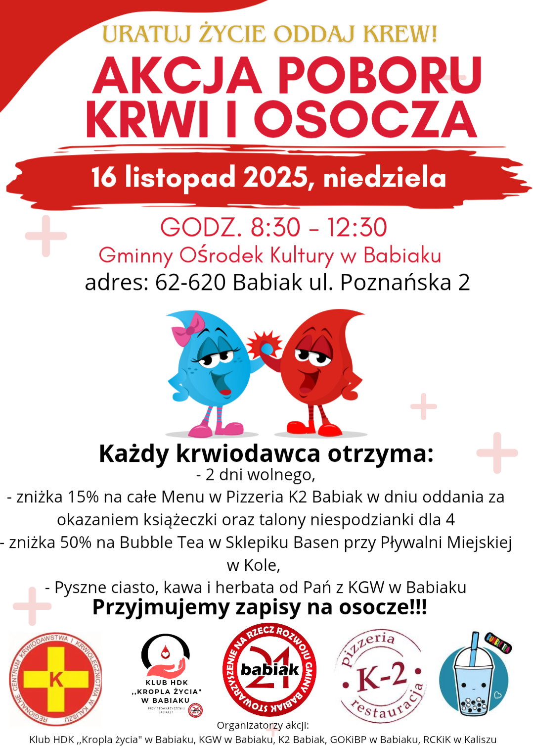 Akcja poboru krwi i osocza odbędzie się w Gminnym Ośrodku Kultury w Babiaku. Rozpocznie się o godzinie 8:30 i potrwa do 12:30. Każdy krwiodawca otrzyma dwa dni wolnego, zniżkę 15% na menu w Pizzerii K2 w Babiaku oraz zniżkę 50% na Bubble Tea w Sklepiku Basen przy Pływalni Miejskiej w Kole. Dodatkowo zapewnione będą kawa, herbata i ciasto od KGW w Babiaku. Przyjmowane są zapisy na osocze.