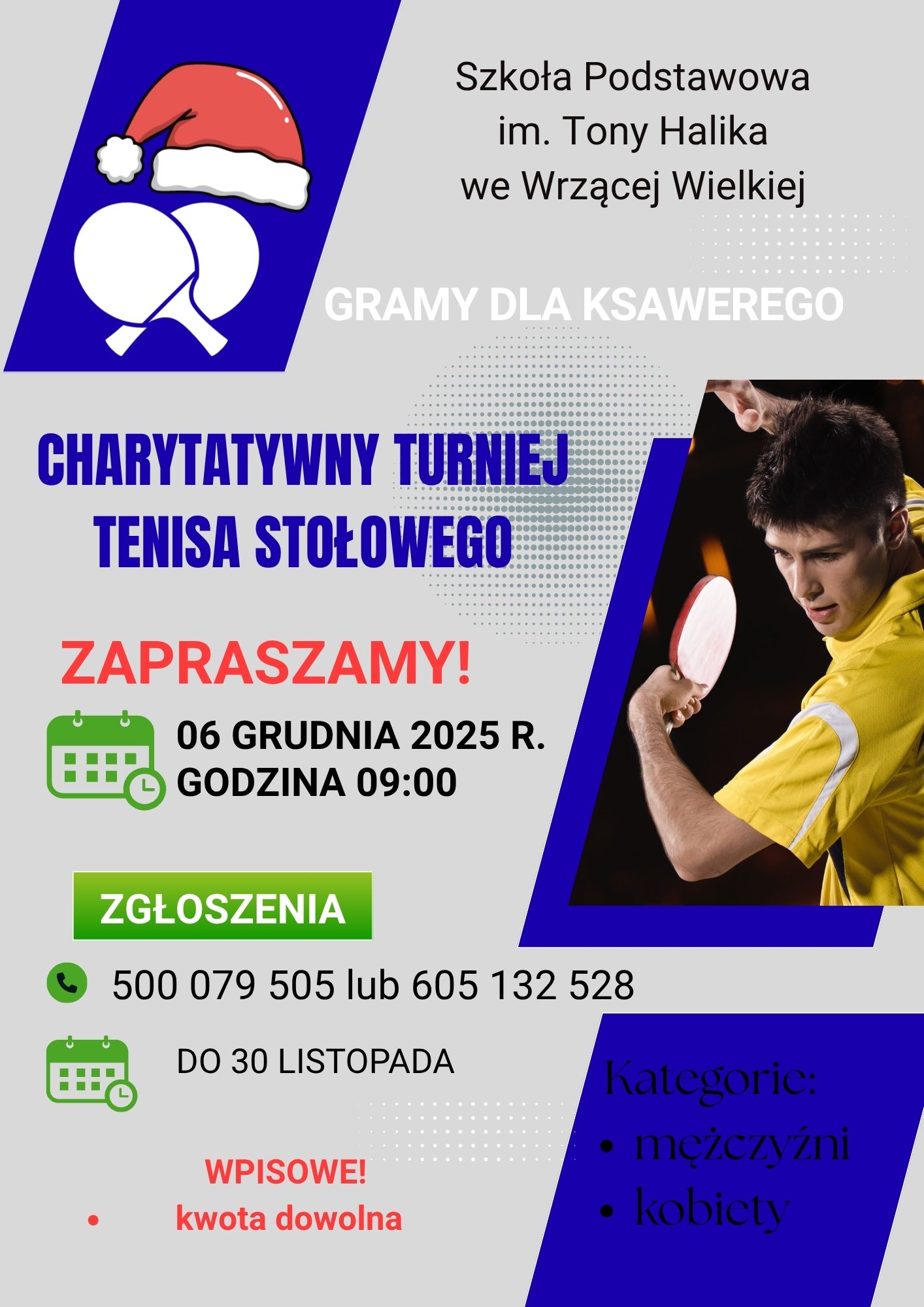 Wydarzenie to charytatywny turniej tenisa stołowego odbywający się w miejscowości Wrząca Wielka. Organizowane jest ze specjalnym zamiarem pomocy Ksawe-rowi. W turnieju mogą brać udział zarówno kobiety, jak i mężczyźni. Zgłoszenia są przyjmowane do 30 listopada, a wpisowe opiera się na dowolnie wybranej kwocie. Kontaktowy numer telefonu dla chętnych to 500 079 505 lub 605 132 528.